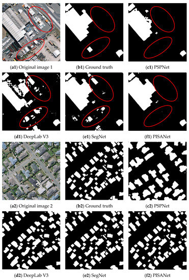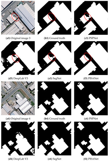 Some representative areas were selected to display the experimental results on the WHU Building Dataset for qualitative analysis (Figure 8). Original image 1 shows objects similar to containers, which are easily confused with buildings, original image 2 shows small buildings and original images 3 and 4 show large buildings with different shapes. Judging from the experimental results, PSPNet and DeepLab V3 were prone to leave buildings connected, did not distinguish individual buildings well and misclassified some of the non-building parts. SegNet and PISANet both performed well on large and small buildings. However, SegNet was more prone to incorrect extractions (red circle in Figure 8), and PISANet extracted buildings more accurately because it captures local and global features simultaneously.