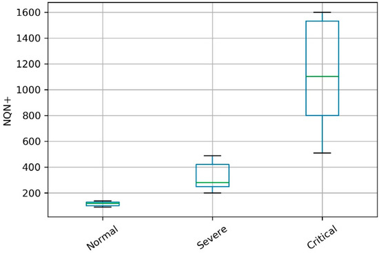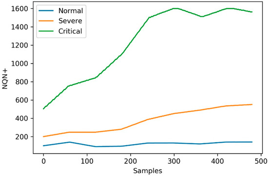 The simulated scenarios considered the temporal evolution of the Normalized Quantity Number NQN+ in three operating conditions in relation to the severity of partial discharges, called normal, severe, and critical condition. The NQN+ values were obtained from the three conditions, as shown in Figure 3. The NQN+ values were extracted from the graphics in Figure 3 using a web-based plot digitizing tool for extracting data from a time series including XY coordinates, called WebPlotDigitizer [37]. In the WebPlotDigitizer tool, after loading the image and calibrating the axes, assuming that axes are perfectly aligned with image coordinates, the data were extracted automatically using the ‘X step with interpolation algorithm‘ available in the tool, with the parameters adjusted as described in Table 1 in order to get equivalent to a daily sample. The NQN values generated are available with this work as Supplementary Material.