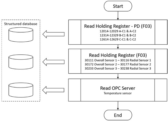 After configuring the acquisition control parameters, the values were collected and stored in structured databases, as shown in the diagram in Figure 7, for partial discharges, temperature, and vibration. The temperature values were read from an open platform communications server, PCL Siemens S7, which specified the communication of real-time sensor data.