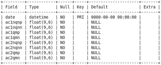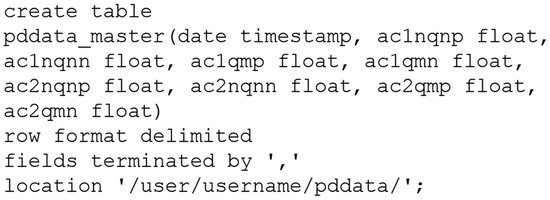 First, we created two sqoop jobs to get the collected sensor data from a structured mysql database to the Hadoop HDFS. The partial discharge data were in a table called pddata from the hydrogenerator_db database, which has the structure illustrated in Figure 8, as an example for the set of sensors A-C1 & A-C2 and the variables NQN+, NQN–, Qm+, and Qm–.