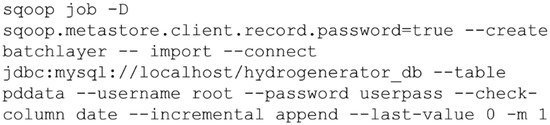 The next step of the process was to ingest data into Hadoop’s HDFS from hydrogenerator_db database to create the batch and the speed layers. We created two sqoop jobs to connect to the database and import data to the HDFS, according to the script in Figure 9 for batch layer, for example.