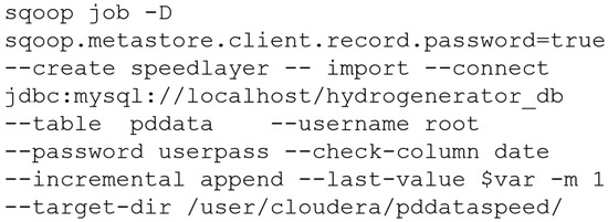 The first step in the development of the proposed system concerns the data ingestion in Hadoop’s HDFS system from the data source. This ingestion task was performed using the Apache Sqoop tool, which is designed to transfer data between structured datastores and the HDFS file system. The tool used in this data ingestion task can vary depending on how the data collected by the sensors are stored. In this stage, two different types of sqoop jobs were created, one job to collect data in batches on a monthly basis, which may vary depending on the application, and another job for online collection as new data were generated.