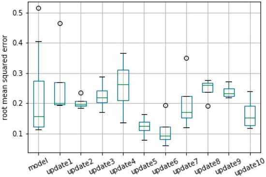Performance of the prediction model evaluated by the RMSE is presented using a boxplot from 10 runs. Results from the original model, which was created with batch layer data, and from all consecutive model updates are presented in Figure 13 and Figure 14 for scenarios normal and severe, respectively.