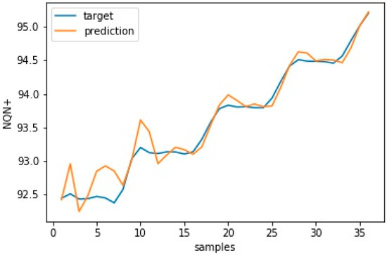It is worth noting that the RMSE did not consider variations in the data collected in the speed layer and that this variation interfered with the accuracy of the model. Thus, even if an update improves the forecasting capacity of the model, the RMSE value may be higher than the previous error due to the variance of the new data used to evaluate this update. Figure 15 and Figure 16 show the model’s validation results with plots for target versus prediction data for training and test data for scenario 1—normal.