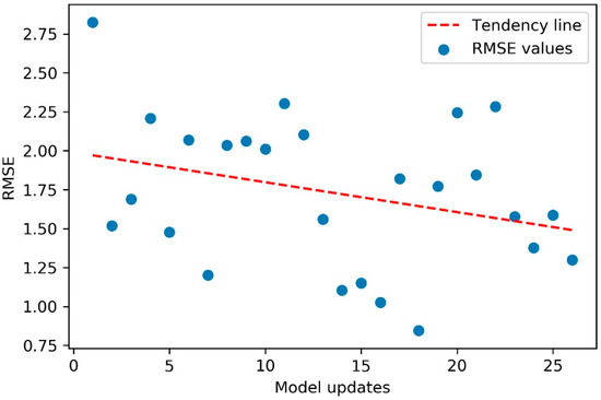 Scatter plot of RMSE values for scenario 3—critical. Tendency line shows that the model tended to stay more accurate as new updates were performed.
