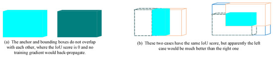 Moreover, the 3D object detector always generates abundant anchors to predict the true bounding boxes, whose number is much more than that of ground truth bounding boxes. However, due to the meaning of IoU and the setting of corresponding traditional IoU loss, only anchors which overlap with ground truth would contribute to the optimization, while those anchors which have no overlapping are simply punished and contribute nothing. As shown in Figure 3a, the anchor and bounding boxes do not overlap with each other, where the IoU score is 0 and no training gradient would back-propagate. However, the positive anchors only account a small part of total generated anchors, resulting in limited income compared with such a heavy computational cost. However, these non-overlapping anchors are still meaningful. We believe that even without overlapping, anchors which are near to ground truth bounding boxes are more useful than these anchors far from that. These non-overlapping anchors could provide a constant for RPN to build a position sensitivity which enables RPN to generate anchors close to true bounding boxes. Moreover, this distance information could adjust the inconsistency between loss and the quality of obtained bounding boxes. As shown in Figure 3b, these two cases have the same IoU score, but apparently the left case would be much better than the right one, i.e., the two axes are aligned in left, but one axis is aligned in right.