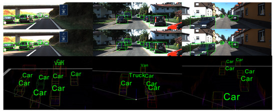 Considering that the points of the distant objects in point cloud are too sparse to produce effective features, we select the point cloud in the range of [−40, 40] × [0, 70] × [ −1, 3] according to the X, Y, Z coordinate system. We extracted 16,382 point clouds from the raw point cloud data as the input of the point cloud feature extraction network and used a set abstraction layer to perform the input LIDAR point with the size of 4096,1024, 256, 64. The subsequent propagation layer was originally used for a point cloud semantic segmentation and 3D scheme generation, therefore we kept it in our network to maintain semantic information. We set the RGB image input resolution to , and set up the up-sampling module and the contact module to fuse the image features of each step. The adam optimizer is adopted to optimize the network, which sets the initial learning efficiency to 0.002, the weight to 0.001, the training epoch to 50, and the batch size to 12. Our approach is implemented on single RTX 2080Ti, which has 11G memory.