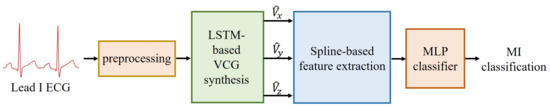 This study proposes a new method for automatic MI classification using the single-lead derived VCG. As shown in Figure 2, the proposed method consists of four stages, i.e., preprocessing, VCG synthesis, feature extraction, and classification. The raw ECG signals are preprocessed to remove various kinds of noise associated with them. Next, a patient-specific reconstruction method is used to synthesize the 3-lead VCG from lead I ECG. In the feature extraction stage, the clinically significant features are extracted from three derived Frank leads that quantify the VCG abnormalities due to MI. Later in the classification stage, the most likely ECG class has to be predicted from the analysis of the feature data.