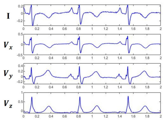 Another problem which requires further investigation is to test the feasibility of single-lead ECG in classifying different types of MI. Several wearable devices which use single-lead ECG to facilitate continuous ambulatory monitoring have recently appeared on the market [26]. While these devices make regular ECG recording possible, their practical applicability for cardiac diagnostics remain limited. This is because physicians need checking ECG patterns to diagnose by correlating information from two or more ECG leads. For example, abnormalities in chest leads ( to ) are suggestive of a problem in the posterior wall of the heart and no abnormalities will be detected by a single lead [27]. The ability to transform from single-lead ECG to 12-lead ECG enables the wider use of wearable devices for clinical diagnostic applications. However, prior attempts to synthesize 12-lead ECG or 3-lead VCG from a single lead have not been successful. Most existing lead transformation approaches require at least two synchronously acquired leads [28,29,30,31,32,33,34,35,36,37,38,39,40], hampering their applicability to the present context. This has motivated our investigation into trying to synthesize the 3-lead VCG from single-lead ECG signal. Since lead I is provided by most wearable devices, we propose a derived VCG system by considering the lead I ECG signal as input and three Frank leads as output of the system.