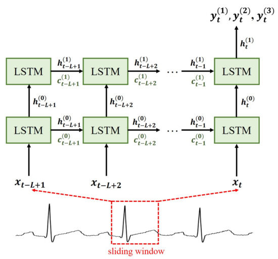 Synthesis of 3-lead VCG from reduced-lead set of 12-lead ECG [32,35,36,37,38,39,40] has been investigated in the past to satisfy the need for more wearing comfort and ambulatory situations. Most methods [35,36,37,38,39,40] are based on linear transformation and the differences between them are in coefficients of transformation matrices. In [32], Vozda et al. used nonlinear methods such as ANN to synthesize the 3-lead VCG from quasi-orthogonal leads I, II, and . Most current approaches to VCG synthesis focus on the inter-lead correlation, with less emphasis placed on the intra-lead correlation. The ECG signals from leads I, , and are shown in Figure 3. It can be observed that, in addition to spatially correlated information in different leads, temporally correlated information can also be found between different waves within a single lead. The lead signals are narrow angle projections of the same electric heart vector and hence correlations can be found among the signals of various leads. Moreover, the cardiac cycle is quasi-periodic in nature and hence intra-correlations are evident between different characteristic waves. A model which can simultaneously learn the intra- and inter-lead correlations of ECG signals is expected to further improve the reconstruction accuracy. This is because synthesizing a VCG lead essentially involves estimating morphology of the waveform and timings of the characteristic waves. The morphology information holds significant similarity within a lead and hence it can be obtained by exploiting the intra-lead correlation. Similarly, inter-lead correlation can be used to derive the temporal information because timings of the characteristic waves are highly correlated between synchronously recorded leads. This can be achieved by using RNN [41] based models as they can combine information from the present and previous inputs to decide the present output. Recognizing this, we propose a patient-specific VCG synthesis method based on a sliding-window approach together with LSTM network [42]. At the model estimation stage, the LSTM parameters were estimated for each individual by considering the lead I ECG as input and Frank XYZ leads as output of the model.