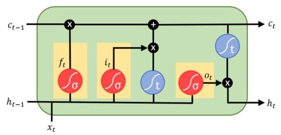 An LSTM model has the units composed of a memory cell, an input gate, an output gate and a forget gate. The structure of the LSTM unit is shown in Figure 5. An LSTM unit computes a mapping from the input to output by calculating the network unit activations using eq:Equation 1eq:Equation 5 iteratively from to T.