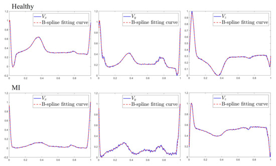 The vector of coefficients is calculated by using the least square spline approximation. Generally, the B-spline approximation of VCG signal yielded better performance with an increase in the value of n. Figure 6 shows the original heartbeat and the spline fitting curve with using one MI sample and one healthy sample. Experimentally, it was found that the use of gives a good trade-off between computational efficiency and the quality of fit. Each normalized heartbeat is transformed into 16 features , and three VCG leads during the time of a given heartbeat have 48 features. Together with the time scaling factor and amplitude scaling factors , the complete heartbeat of 3-lead VCG is transformed as a 52-dimensional feature vector.