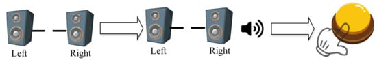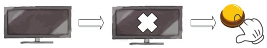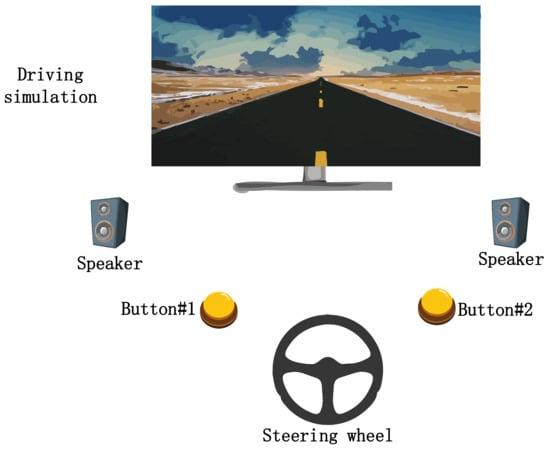 There are 8 tasks during the experiment, as shown in Table 1. To obtain a reference, we define warm-up (WUP) as the baseline of the experiment that is at the beginning of the experiment. In WUP, the subject is asked to drive a car for 2 laps without any stimuli and any errors. Next stage performance (PERFO) is similar to WUP, but the total time of driving is 2% less than WUP. Then the task of “alert“ with video and “vigilance” with audio (TAV) is designed and appeared randomly during the process of the experiment to make the subjects feel tired more easily, which are follow after PERFO with a pseudo-random order, TAV3, TAV1, TAV5, TAV2, TAV4. Please note that they will receive visual or sound stimuli with different frequencies in TAVs stages. Different stimulus frequencies of “alert” or “vigilance” represent the different degree of stimulation, defined as TAV1, TAV2, TAV3, TAV4, and TAV5 with different stimulus intervals [28,29,30,31]. The TAVs duration will be set up depending on the total time spent in WUP. From TAV1 to TAV5, the stimuli intervals are 9800–10,200, 7700–8100, 5900–6300, 4100–4500, and 2300–2700 ms, respectively. The last stage is drowsiness (DROW) with a slow speed just like driving in a crowded city center, without any video or audio stimuli alongside the track for 2 laps. The subject should press “Button#1” with his left finger when ‘X’ appears, which is an “alert” task, and press “Button#2” with his right finger when two consecutive “beep”’s come, which is a “vigilance” task [32,33,34]. “Alert” stimuli is used to mimic the actual road conditions, such as traffic lights, pedestrians crossing the road, other vehicles, etc. (as shown in Figure 2) [35], while “vigilance” stimuli is used to stimulate the car radio, engine noise or a phone call (as shown in Figure 3). Usually, the whole experiment will last 2 h. WUP, PERFO, 5 TAVs, and DROW will need about 10 min, 2% less than that of WUP, 1 h, and 20 min, respectively. There is a break of about 5 min between each stage.