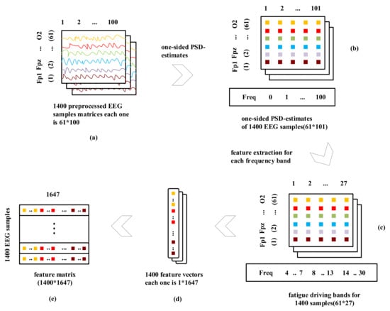 Before feeding the EEG data of each subject into the classifier for training, we extract the power spectrum density (PSD) features from EEG data of each subject [38,39], which is usually used for feature extraction in EEG analysis. The detailed PSD feature exaction procedure is listed as the following steps: