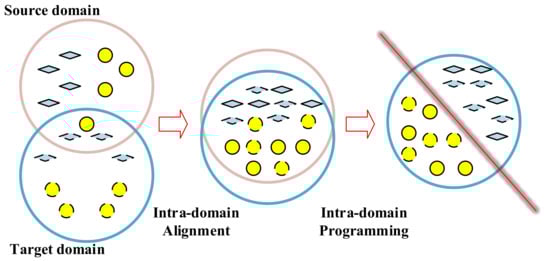 EasyTL [24] is a kind of transfer-learning method that has been applied in the field of image applications and achieved better performance. It consists of two parts: intra-domain alignment and intra-domain programming, as shown in Figure 6. For intra-domain alignment, it aligns n s samples to form the sample set Ω s in the source domain s as x i s i = 1 n s , and n t samples to form the sample set Ω t in the target domain t as x j t j = 1 n t through intra-domain alignment [41], aiming at making the difference between s and t as small as possible. Please note that the source domain is ( x i s , y i s ) i = 1 n s and the target domain is x j t j = 1 n t .