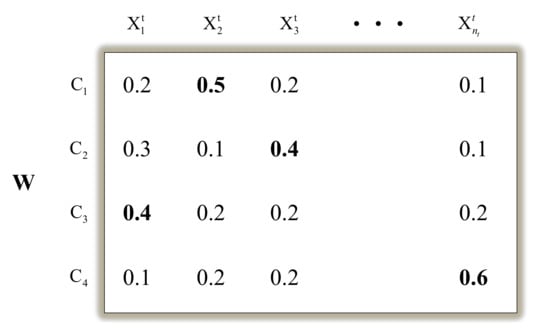 Figure 7. An example of the probability annotation matrix. The rows denote the class labels, and the columns denote the target samples. The entry value W i j indicates the annotation probability of x j t belonging to class C i ; i = 1 , 2 , 3 , 4 and j = 1 , 2 , , n t . The class labels of x j t belonging to class C i are marked in bold.