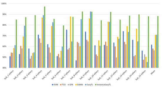 Figure 9. Classification accuracy comparison. X axis is represented as Sub_i-others (i = 1, 2, …, 15), where Sub_i is the samples of target domain, others are the samples of source domain. For example, the samples of “Sub_1” are used as the target domain, and those of the other 14 subjects are represented as “others” as the source domain. Y axis shows classification accuracy of InstanceEasyTL and other methods used for comparison.