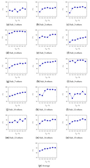In this section, we count the impact of different ratio of T t d : Ω t on InstanceEasyTL. Here, we set the ratio of T t d : Ω t to be 0.1, 0.2, 0.3, 0.4, and 0.5, respectively. We can find that different ratio of T t d : Ω t results in different classification accuracy on InstanceEasyTL, as shown in Figure 10. From Figure 10, the cross-subject recognition accuracy of InstanceEasyTL is above 80% and shows an increasing trend as the ratio of T t d : Ω t increases, except for very few exceptions. Similar results can also be observed from Figure 10p by calculating the average accuracy of InstanceEasyTL. We can then conclude that the higher the ratio of T t d : Ω t , the higher the accuracy of InstanceEasyTL.