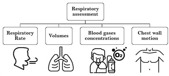 Breathing monitoring is an important component of clinical detection of vital distress, and is performed for all patients in a hospital, whether in the emergency room, a general or specific ward, or in the intensive care unit. The monitoring of a patient respiration mainly comprises an assessment of the chest wall motion [1,2,3,4] and measurement of physiological parameters, such as airflow and respiratory volumes [5,6,7,8,9], respiratory rate (RR) [10,11,12,13], the resulting transcutaneous oxygen saturation (SpO2), and respiratory CO2 removal [14,15,16,17,18]. Respiration assessment can be classified around these four elements, as shown in Figure 1.