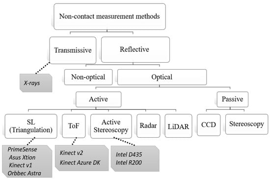 Non-contact sensors’ technology classification: SL = Structured-Light, ToF = Time-of-Flight, LiDAR = Light Detection and Ranging, CCD = charge coupled device.