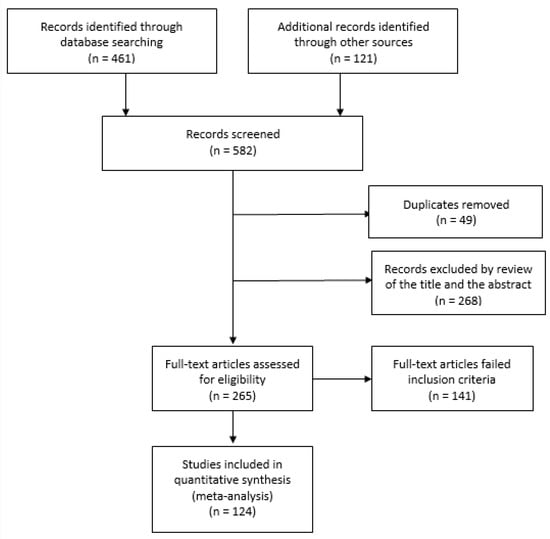 Our initial search identified a total of 582 references. As illustrated in the flow diagram of Figure 3, 54.46% of the retrieved papers (n = 317) were eliminated after duplicates removal, title, and abstract screening.