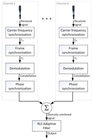 The input signal is the voltage at the output of the -th hydrophone. First, synchronization of the carrier frequency of the received signal is performed. Then, frame synchronization is performed using the known preamble transmitted at the beginning of each frame. During the frame synchronization, the received signal is correlated with a reference signal (modulated preamble) and the detection of the correlation maximum is performed. The found maximum indicates the start of the frame. This is followed by demodulation and phase correction. The signals from each receiving channel prepared this way are added algebraically. Subsequently, the collective signal is processed using the RLS adaptive filter.