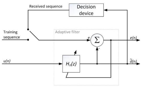 Adaptive channel correction can be performed in a circuit, where the input signal is the received sequence , and the reference signal is a known training sequence. The task of the filter is to convert the received sequence into the sequence closest to the one sent . Figure 2 shows the system of adaptive channel correction, where —estimate of the transmitted sequence, —adaptation error, —transfer function of the correction filter. The system assumes that an Infinite Impulse Response (IIR) filter will be used. The number of filter taps depends on the maximum channel delay. The length of the training sequence must be two times longer than the maximum channel delay.