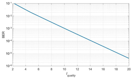 For each transmission, the BER and the parameter were determined and for a given SNR value they were averaged over all the implementations. Figure 3 shows the experimentally obtained (in a simulation environment) relation between the transmission quality (expressed by the BER coefficient) and the proposed parameter.