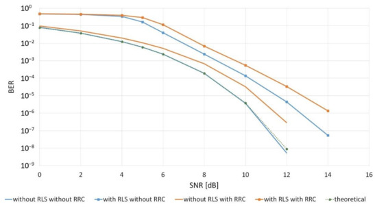 Figure 4 shows that the theoretical curve coincides with the curve obtained from the simulation without the use of the RLS and RRC filter, which proves that the simulation has been correctly implemented. Moreover, the prediction that the RLS filter in the presence of noise did not improve the reception quality was confirmed. The use of the RRC filter, due to the fact that it interferes with the spectrum of the transmitted signal, deteriorates the reception quality.