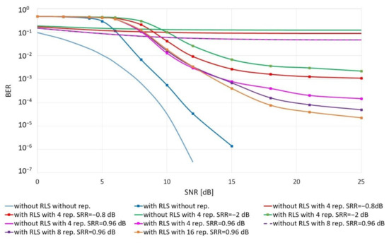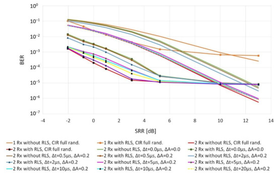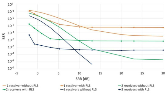 The obtained results prove that the use of the adaptive RLS filter is justified only when the value of the total power of the replicas is sufficiently large in relation to the signal’s first replica. The SRR value, at which it is reasonable to use adaptive RLS filtering, depends on the SNR. Then, the quality of the reception at a given SNR coincides with the characteristics from Figure 5.