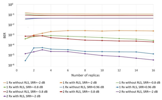Figure 5 shows the quality of the reception as a function of the signal power to the noise power ratio for a different number of replicas and the value.