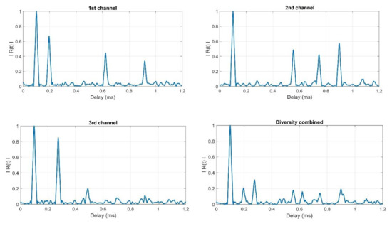 As it is shown in Figure 7, after diversity combining, the amplitude of all replicas present in each channel decreased approximately as many times as there are receiving channels. For example, the amplitude of the first replica at the first channel at the time moment 0.2 ms is 0.67. In diversity combined signal, the amplitude of this replica (also present at the time of 0.2 ms) is 0.2, which is almost three times lower because we use three receiving channels. The reduction factor is not exactly equal to the number of receiving channels used. It is caused by the fact that the amplitudes at any given point in time in the remaining channels are non-zero. It should also be noted that all replicas that appear in the individual receiving channels are visible in the signal after the diversity combining.