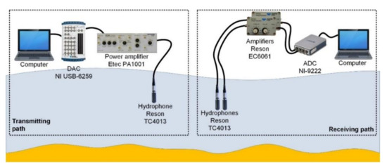 The transmitting path uses as the projector a TC4013 hydrophone (Teledyne RESON A/S, Denmark) connected to the P1001 power amplifier (Etec A/S, Denmark), which was connected to the NI USB-6259 digital-to-analog converter card (National Instruments, USA), and then to the computer with the NI SignalExpress (National Instruments, USA) software via USB interface. In the receiving path, two TC4013 hydrophones were used, each connected to the EC6061 amplifier (Teledyne RESON A/S, Denmark) and then to the NI-9222 analog-to-digital converter (National Instruments, USA), which was connected via an Ethernet interface to a computer with NI SignalExpress software.