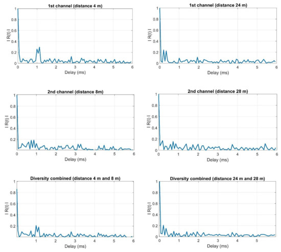 The obtained results indicate that at the distances of 4 m and 8 m, the use of the RLS filter is justified as there are clearly relatively high power replicas. The quality with the RLS is clearly better not only through BER, but also through the parameter in relation to the reception without the RLS. In the case of the reception at the distance of 24 m and 28 m, the replicas are on the background level, therefore the use of the RLS leads to a deterioration in quality, while diversity combining is justified. It should be noted that these conclusions are consistent with those resulting from the simulation tests.