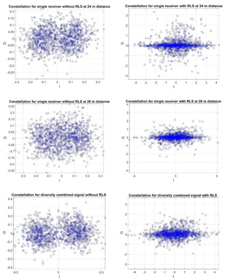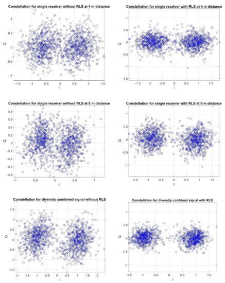 Figure 12 clearly shows that the use of the RLS filter for both the single receiver and the diversity combining improves the reception quality, i.e., there is a clear increase in the concentration of the constellation points. In Figure 13, first, we can see a significant deterioration of the signal-to-noise ratio in relation to the case presented in Figure 12. Moreover, the use of RLS filtering does not improve the reception quality. However, it should be noted that diversity combining without RLS improves the reception quality, which can be seen by increasing the concentration of the constellations. This is because diversity combining improves the signal-to-noise ratio.