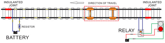 If for some reason, the relay is not energized, the section is now indicated as occupied. Figure 2 illustrates an example, where the TC is occupied by the presence of a train. The current supplied by the battery drive through the rail and returns through the contact established with the wheels of the train [19,20]. As the relay is no longer energized, the section is indicated as occupied. When a rail break occurs, the track’s electrical discontinuity is indicated as the stretch’s occupation.