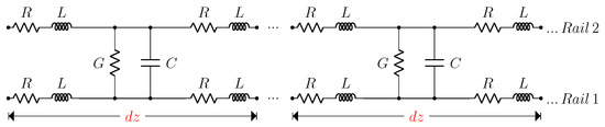 In order to analyze the wave propagation in the TC, it can be modeled as a multi-conductor transmission line (MTL) [23,24]. Figure 3 shows a model for a two-wire line with earth return, which can be used as an equivalent representation of a section of a single rail track. In Figure 3, and are the self impedances per unit length, and are the self admittances per unit length, is the mutual impedance per unit length between the lines and is the mutual admittance per unit length between the lines.