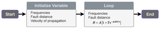 The demonstration presented in Figure 9, allows estimating the fault position by detecting null for the simulated equations. In this situation, with the obtained Fitting, it would be sufficient to correlate the frequency of the null point identified to estimate the failure’s position. In the simulation, the velocity of propagation v was considered as 90% the velocity of light, and the frequency bandwidth was 100 Hz up to 300 kHz.