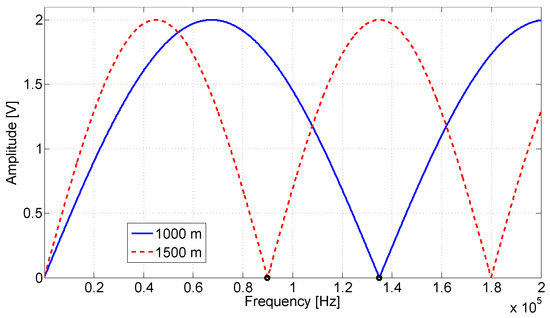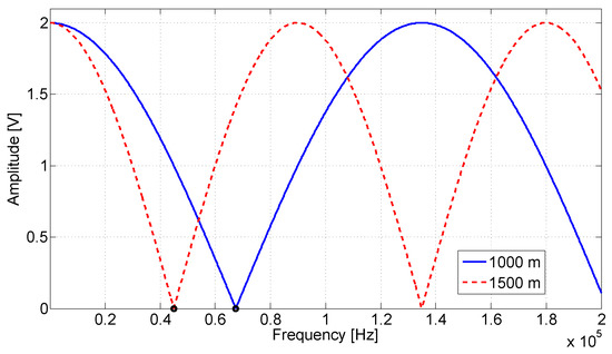 Figure 9 shows the relationship between the fault position and the frequency of the first null of the amplitude waveform obtained with Equation (22) simulation. In the figure, other fault positions were generated, and null detection was applied. It can be observed in Figure 6 the identification of the null point is marked with a circle. These marks are at 89,900 and 134,900 Hz frequencies, which correspond with null point detection in a short fault with a distance of 1500 m and 1000 m, respectively. The same analysis can be observed for Figure 7 and Figure 8. In them were also identified as the null points marked with a circle.