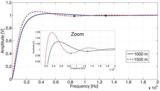 The use of a lossless TL for modeling the TC is not reasonable [28], therefore, the behavior of B with respect to the frequency is different from the one observed in Figure 6. A simplified simulation of Equation (20) for lossy transmission lines with low impedance faults at 1000 m and 1500 m was carried out, considering a first-order frequency-dependent attenuation for the reflected waveform and, for sake of simplicity, the propagation velocity v was considered constant as 90% the velocity of light. The result can be seen in Figure 8, where it is possible to verify the attenuation effect on the curve behavior in contrast to the behavior seen in Figure 6.