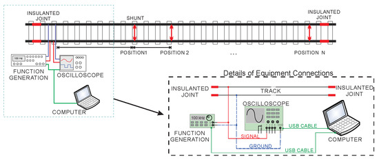 The connection scheme of the proposed system on the TC can be seen in Figure 10. The system is basically composed of a sinusoidal source generation, a digital signal acquisition system and a processing and control device. The figure also shows the details of the connections between the equipment and the rails. The signal generator and oscilloscope are connected to the computer via a USB cable. The signal tip of the oscilloscope and the signal generator are connected on one side of the rails and the other the ground cables of both types of equipment. The software developed allows the adjustment of some parameters in the signal generator such as frequency and amplitude and the data storage process in the oscilloscope. It automates the actuation of the equipment and performs the frequency variation of the injected signal during the analysis.