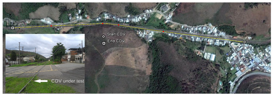 Envisaging the validation of the proposed method for identification and localization of TC faults, a field test was carried out at the MRS rail network in Brazil. A TC with approximately 1500 m long was used, located at Ewbank da Câmara, Minas Gerais. Figure 12 is a satellite image showing the TC under test. The proposed system was connected in the opposite end of the TC with respect to the relay and the TC voltage source was disconnected from the rails to avoid interference.