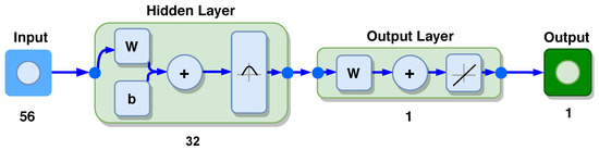 Structural diagram of the Generalised Regression Neural Network (GRNN). The network had 56 input and 32 hidden layers, where the normal distribution function was used as a probability density function. It has one output layer with a linear function.