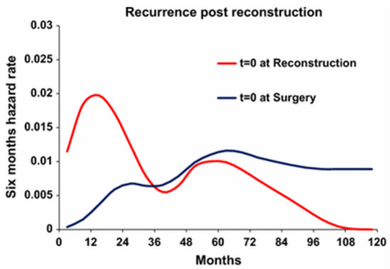 Recurrence pattern for the reconstructed patients (n = 312) with T = 0 set at reconstruction (red line) and at primary surgery (blue line). X-axis represents time in months. Y-axis represents six-month hazard rate. This figure is taken from Dillekås, Demicheli, Ardoino, Jensen, Biganzoli, and Straume. The recurrence pattern following delayed breast reconstruction after mastectomy for breast cancer suggests a systemic effect of surgery on occult dormant micrometastases [10].