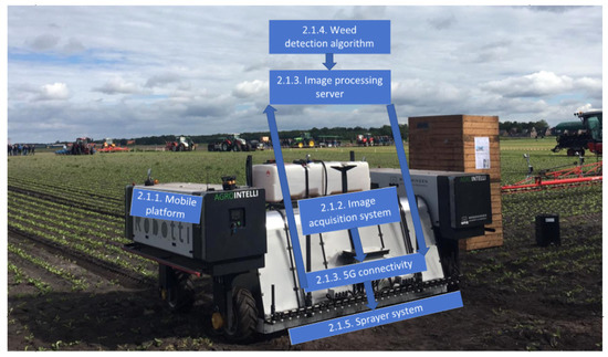 Figure 1 shows the robotic system with different components that will be discussed in the next subsections. The robot consisted of a mobile platform (Section 2.1.1) that autonomously navigated through the field, while the image-acquisition system on board the robot took images of the field (Section 2.1.2). The images were sent to a processing server, about 200 km offsite, using a 5G Wireless Wide Area Network (WWAN). On the processing server (Section 2.1.3), the images were processed by the weed-detection algorithm (Section 2.1.4). The locations of the detected plants were sent back to the robot, through the 5G connectivity system. The computer on the robot used the plant detections to control the spraying system, which applied the herbicide glyphosate at the right location (Section 2.1.5).