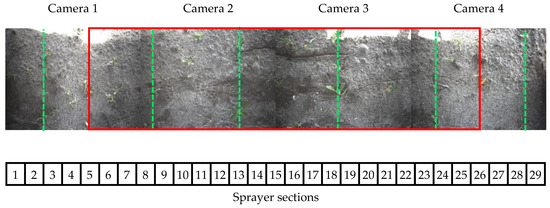 Overview of the camera and sprayer system. The field of view of the four cameras is shown by the four pictures. The field of view of the cameras does not overlap. The locations of the 29 sprayer sections are shown in the numbered blocks below the images. The four cameras together cover six rows of sugar beets, indicated with the green dotted lines. The trial plots only contain four out of the six crop rows. The area of the trial plot is indicated with the red square.