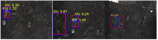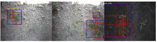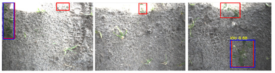Figure 12. Three examples of multiple potato plants detected as a single potato plant. The red rectangles represent the ground-truth annotations and the blue rectangles represent the detections. The detection resulted in a correct spraying action by the robot, hitting the potato plants. These plants are counted as a TP. - Case 3.