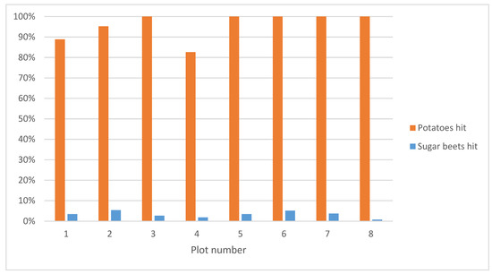 Percentage of potatoes and sugar beets hit by the autonomous spraying system in the test field.