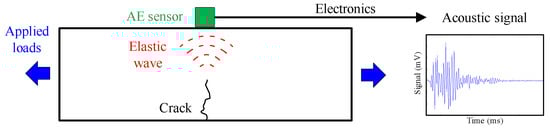 The AE is a phenomenon in which transient elastic waves are generated by the rapid release of strain energy from a localized source due to microstructural changes in the material [40]. Elastic waves travel into the material and move to the surface of a structural element where sensors can detect them. Therefore, an AE monitoring system requires two components: a source, such as a crack propagation or a tendon failure; and a transducer, which receives and acquires the elastic wave [18]. Figure 1 shows the working principle of an AE monitoring system.