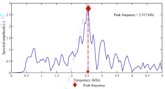 As far as the classification of different types of damage based on the AE technique is concerned, in the MARSE—load graph (Figure 16c), we can recognize three events between 5200 kN and 5800 kN with a signal strength around ten times higher than the others. They may have been generated by different sources than concrete cracks, such as post-tensioned steel wires failure. Again, a campaign of load tests on girders monitored by AE sensors followed by their autopsy would help in the correlation between the AE results and the types of damage that occurred during the load tests. Such a campaign would offer useful insights also into the difference between results from sensors T2AE1 and T2AE2 in the frequency domain (Figure 17): data from the first sensor point out two clusters around 1 kHz and 2.8 kHz, while data from the second sensor provide more scattered peak-frequencies.